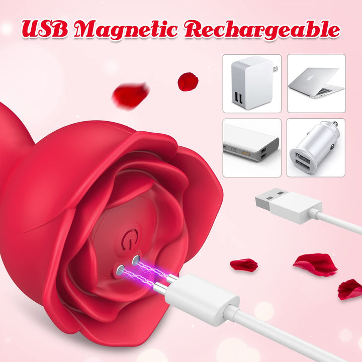 • USB Magnetic Rechargeable & Waterproof. This rose stimulator for women is USB magnetic rechargeable, which can improve the charging efficiency as well as product battery life. And this rose toy is IPX7-level waterproof.